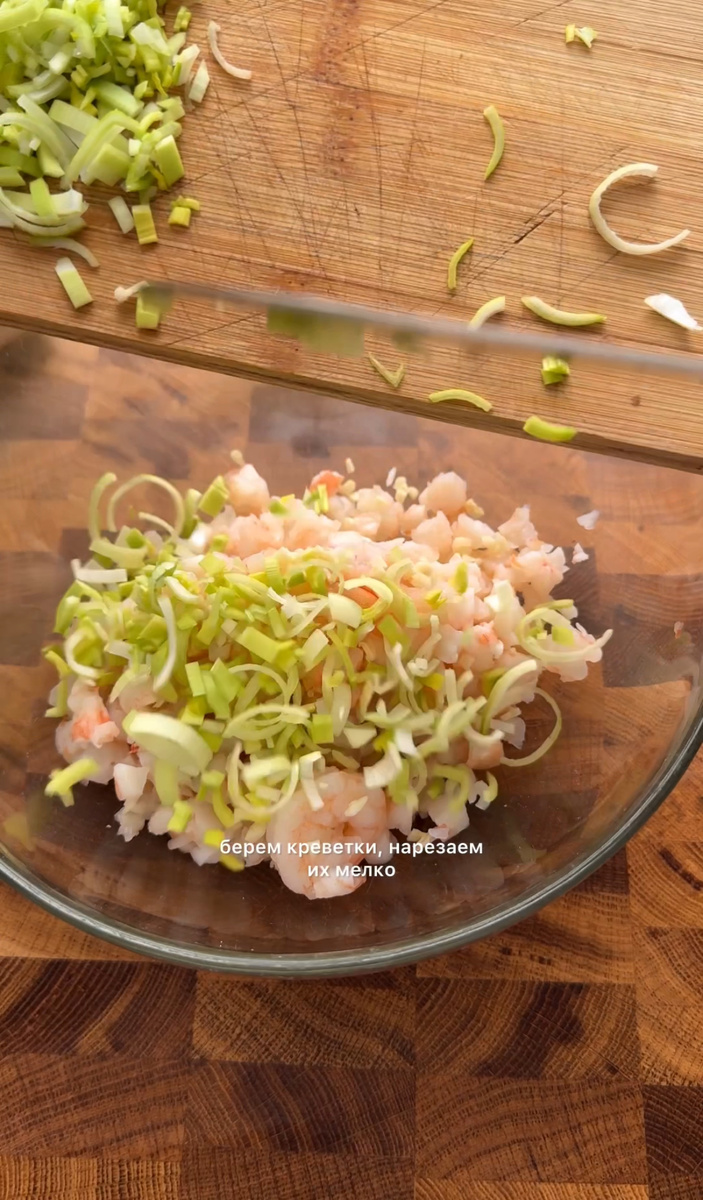 Рисовую бумагу смочить, нарезать на треугольники, креветки нарезать, добавить чеснок, соус и лук, все перемешать, сформировать хинкали!