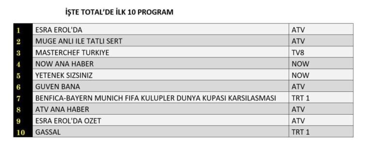 🔥 Вторник, 24 июня 2025 года, выдался жарким не только из-за летнего солнца, но и благодаря напряжённой борьбе за зрительское внимание! Редакция сайта cheek-look.ru изучила свежие рейтинги и готова раскрыть все детали этого телевизионного противостояния. Кто же стал фаворитом? Чьи проекты заставили миллионы зрителей прилипнуть к экранам? Давайте разберёмся! 🎤 Безоговорочным лидером в общей группе (Total) стала программа «Esra Erol’da» — видимо, её гости и откровенные истории вновь нашли отклик у аудитории. На втором месте — «Müge Anlı ile Tatlı Sert», где драматичные расследования и эмоциональные развязки продолжают удерживать зрителей у экранов. А вот третью ступень занял «Masterchef Türkiye» — кулинарные баталии, кажется, слегка сбавили обороты, но всё равно остаются в тройке сильнейших. 🍳 В категории AB всё иначе! Здесь «Masterchef Türkiye» празднует победу, обогнав даже «Müge Anlı ile Tatlı Sert», которая довольствуется серебром. А бронза досталась… футбольному матчу «Benfica —