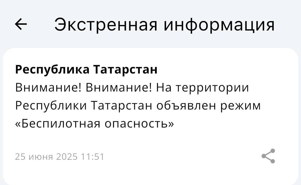 ⚡️ В Татарстане объявлен режим «Беспилотная опасность