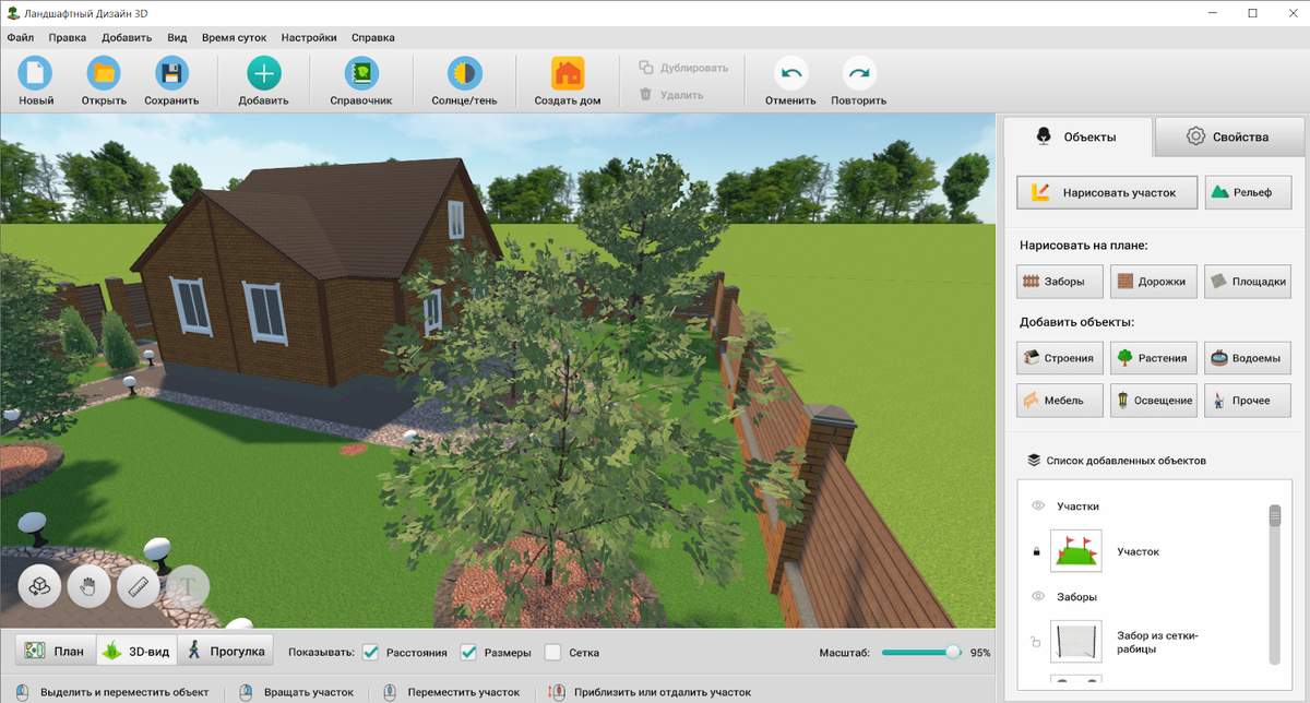 Функциональная, но простая программа для проектирования участка и дома. В ней есть инструменты для сборки зданий из составных элементов. В каталоге более 17 тысяч растений, возможна фильтрация по 25 параметрам — предпочтительный тип почвы, время цветения, срок пересадки и другое. В справочнике есть информация по уходу и характерным болезням для каждой культуры.