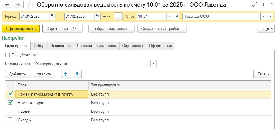Как настроить ОСВ по 10 счету, чтобы видеть группы номенклатуры