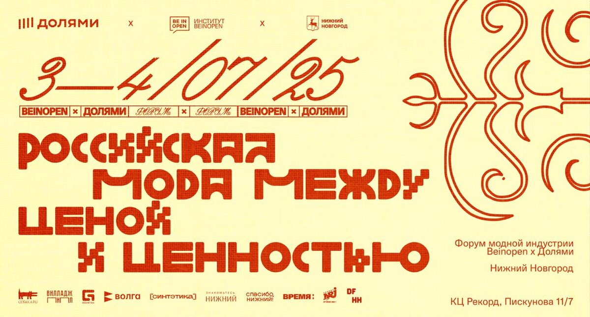 Событие для всех, кому интересна мода (и особенно для тех, кто мечтает запустить свой бренд) — форум Beinopen х Долями «Российская мода между ценой и ценностью», 3 и 4 июля в Нижнем. Форум соберет профессионалов, чтобы обсудить ситуацию в сфере российской моды. Спикеры рассмотрят успешные федеральные и локальные кейсы, дадут практические знания о ведении фэшн-бизнеса и вдохновят вас на свои модные высказывания. Среди спикеров: - Анзор Канкулов, руководитель направления «Мода» в НИУ ВШЭ; - Никита Калмыков, основатель бренда ODOR; - Артур Саргсян, PR и IM в бренде Red September - Татьяна Ермакова, соосновательница ресейл-платформы The Cultt; - Сергей Левин и Екатерина Булгакова, основатели бренда Called a Garment и другие. На событии также будет работать бизнес-зал от партнера форума — сервиса Долями. Там можно будет узнать, какие финансовые инструменты помогают увеличить продажи, задать вопросы по развитию бизнеса, получить индивидуальную консультацию от экспертов. Все события форум