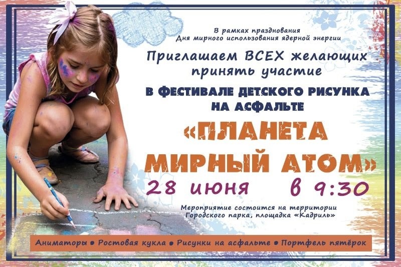 28 июня, в честь празднования Дня мирного использования ядерной энергии и 80-летия атомной промышленности России, в Городском парке состоится фестиваль детского рисунка на асфальте «Планета мирный атом».