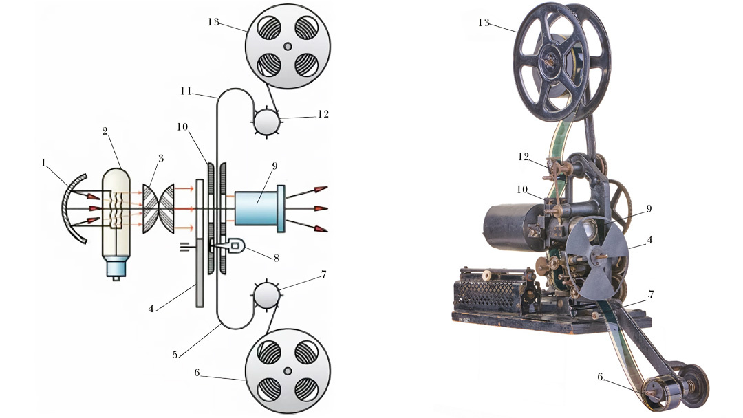 Фильм находится в подающей бобине (13), плёнка проходит через зубчатый барабан (12) и уходит в фильмовый канал (10). Через второй зубчатый барабан (7) плёнка наматывается в принимающую бобину (6). Прерывистое движение плёнки со скоростью 24 кадра в секунду осуществляет грейферный скачковый механизм (8), обтюратор (4) в момент движения плёнки на следующий кадр перекрывает свет от осветителя. Осветитель состоит из самого источника света (2), отражателя (1) и линзы (3). Через объектив (9) увеличенное изображение попадает на экран.