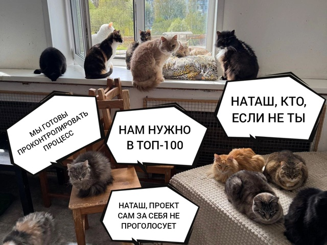 - Создание досугового пространства на базе приюта. - Доработку системы учёта данных, подготовку аналитической информации и взаимодействие с органами власти, ветклиниками, зооволонтёрами по вопросам помощи безнадзорным животным. - Работу по объединению зооволонтёров. Наша мечта — чтобы этот проект оказался в топ-100. Пожалуйста, пройдите по ссылке vk.cc/cMsrNa, авторизуйтесь и проголосуйте за него. Участвуйте в голосовании и приглашайте своих родных и друзей! Ссылка vk.cc/cMsrNa P. S. На фото — котики, которые периодически получают помощь от «Верности».
