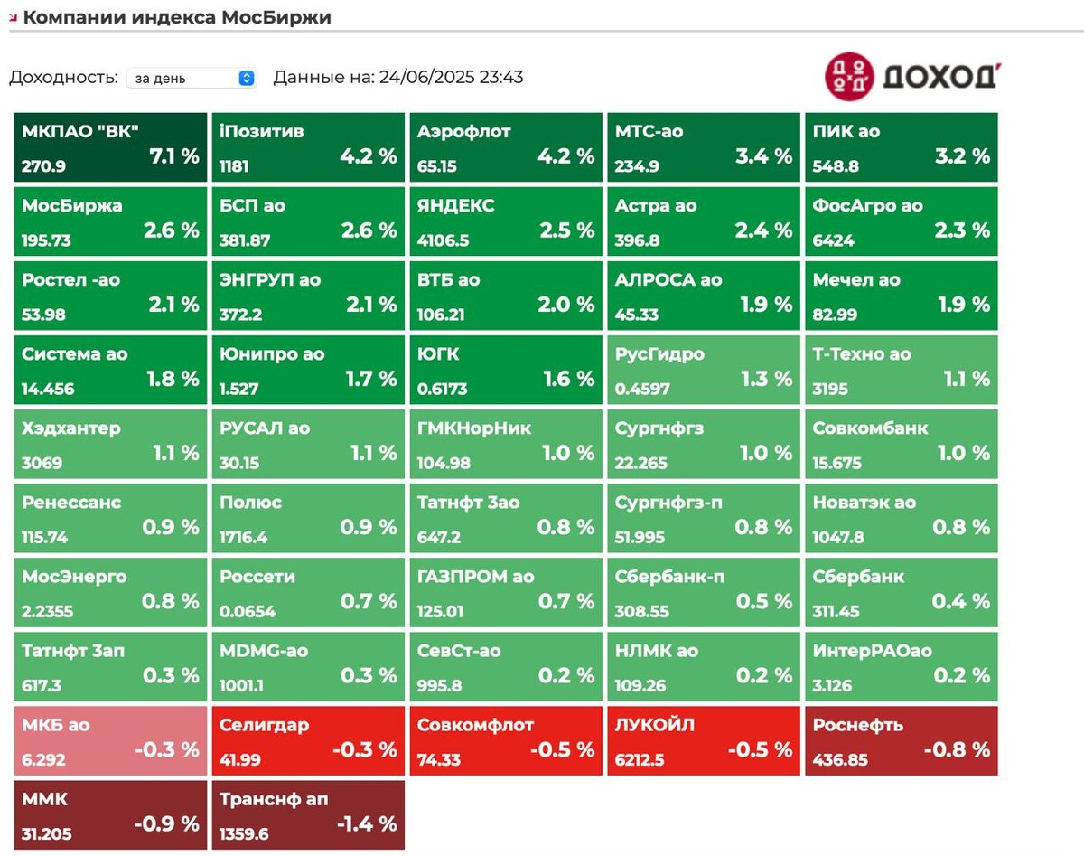 РФ рынок: что нас ждет сегодня Во вторник индекс мосбиржи вырос на 0,8% до 2759 пунктов. Юань вырос на 0,4% до 10,91. Нефть упала на 4% до $66. Трамп и Ближний Восток Он уже начал материться на участников конфликта, после прекращения огня евреи в ответ на бомбежку персами 1 ракетой ударили самолетами по Тегерану. В моменте увидим какую-то паузу, но первопричины конфликта не устранены, да Иранскую ядерную программу отбросили на сколько-то назад, но не более того. Когда-то это опять все стрельнет. Путин и поддержка IT сектора Президент в рамках роста капитализации поручил правительству разработать ряд мер поддержки для IT сектора на бирже до 1 октября 2025. 1)Представить предложения о дополнительных мерах стимулирования покупки профучастниками рынка ценных бумаг акций технологических компаний, реализующих проекты «Технологического суверенитета». 2)Представить предложения о дополнительных мерах налогового стимулирования физических лиц, которые купили акции компаний на первичном или
