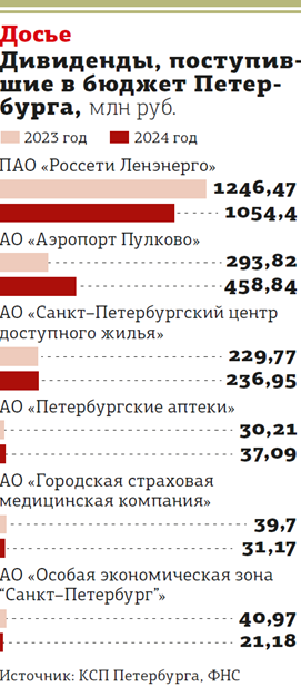 При этом к пяти крупнейшим плательщикам дивидендов КСП не относит ГУП "АТС Смольного". Оно в 2024–м перечислило дивидендов на 433 млн рублей, в 2025–м ожидается 458 млн. АО "Особая экономическая зона “Санкт–Петербург”" в 2025–м может поделиться 35 млн рублей против 21 млн в 2024–м.