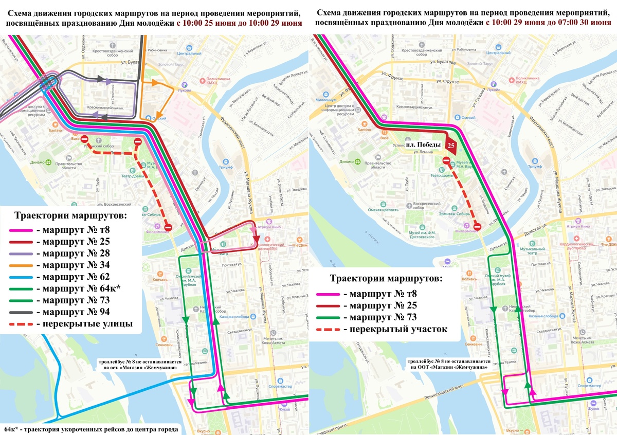 Это связано с перекрытиями дорог для праздника на Соборной площади. Из-за перекрытия нескольких улиц в Омске 25–30 июня изменятся маршруты общественного транспорта. Ограничения коснутся центра города, где планируется празднование Дня молодежи. Сегодня с 10:00 до 10:00 29 июня перекрыли улицу Ленина от Интернациональной до Партизанской, Соборную площадь, улицу Герцена от улицы Интернациональной до Ленина, площадь Победы. В связи с этим автобусы № 25 и 77 и укороченные рейсы маршрута № 64 при движении в центр будут останавливаться на остановке «Дом Туриста». Затем последует разворот с проездом по Комсомольскому мосту, улицам Думской, Маршала Жукова, Лермонтова, проспекту Карла Маркса. В обратном направлении автобусы будут отправляться от остановки «Дом Туриста» до «Госпиталя» и далее – по утвержденной схеме. Автобусы № 28 с моста имени 60-летия Победы поедут по улице Фрунзе, с правым поворотом на улицу Герцена, с остановками на «Ул. Тарская», «Ул. Фрунзе», с правым поворотом на Интернац