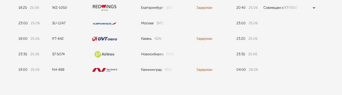 В аэропорту Оренбурга задержаны три рейса в Екатеринбург, Казань, Калининград. У всех вылет назначен был на вечернее время. В международном аэропорту Оренбурга, судя по табло, задержаны три рейса в Екатеринбург, Казань и Калининград. Рейс в Екатеринбург должен отправиться в 18.25 бортом авиакомпании Red Wings, но рейс перенесен на 20:40, в Казань в 18.00 самолетом авиакомпании UVT Aero, перенос на 21:40 и Калининград в 19.00, перенос на 4 утра 26 июня, полет осуществляет компания Nordwind Airlines.