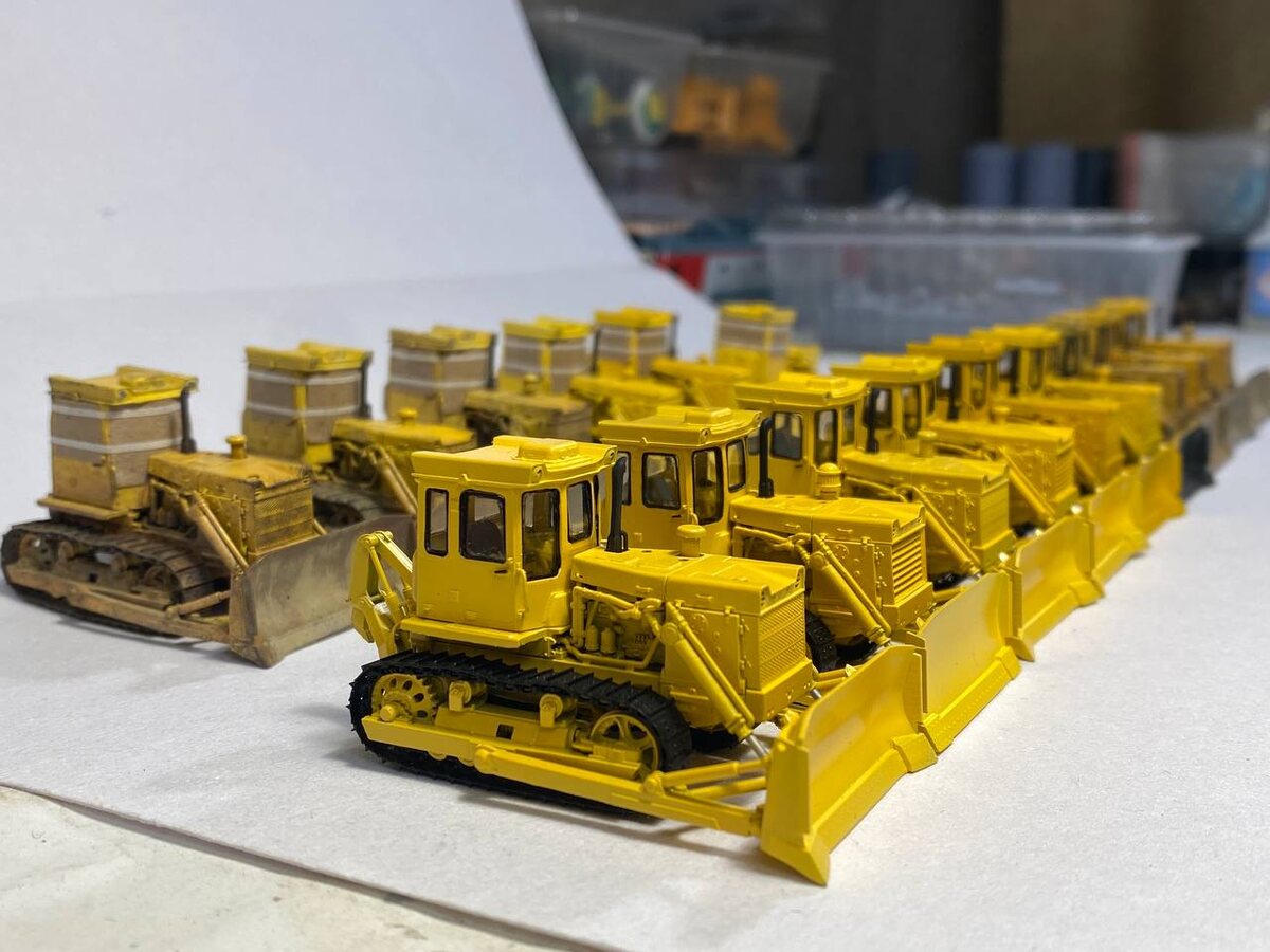 Модели бульдозеров и бульдозеров-рыхлителей изготовлены из наборов для самостоятельной сборки студии SalivanGreen в масштабе 1:87 во всех возможных и доступных вариантах: с рыхлителем и без, с разными видами решеток радиаторов и воздушных фильтров, с разными типами отвалов. SalivanGreen производит наборы в масштабах 1:87, 1:43 и 1:35. При этом в ЖД масштабе доступны четыре вида наборов, позволяющих как раз собрать различающиеся деталями модели. Но никто не мешает взаимозаменять детали из разных наборов - количество доступных вариаций возрастет в таком случае в геометрической прогрессии. Наборы обладают прекрасной детализацией и проработкой деталей. Для 87 масштаба некоторые моменты даже кажутся избыточными, в частности деталировка подкапотного пространства и кабины - просто выше всяких похвал. Всего в рамках небольшой серии было изготовлено полтора десятка моделей разных типов, со следами эксплуатации и без, для полки/макета или для модели вагона в качестве груза, с установленными и