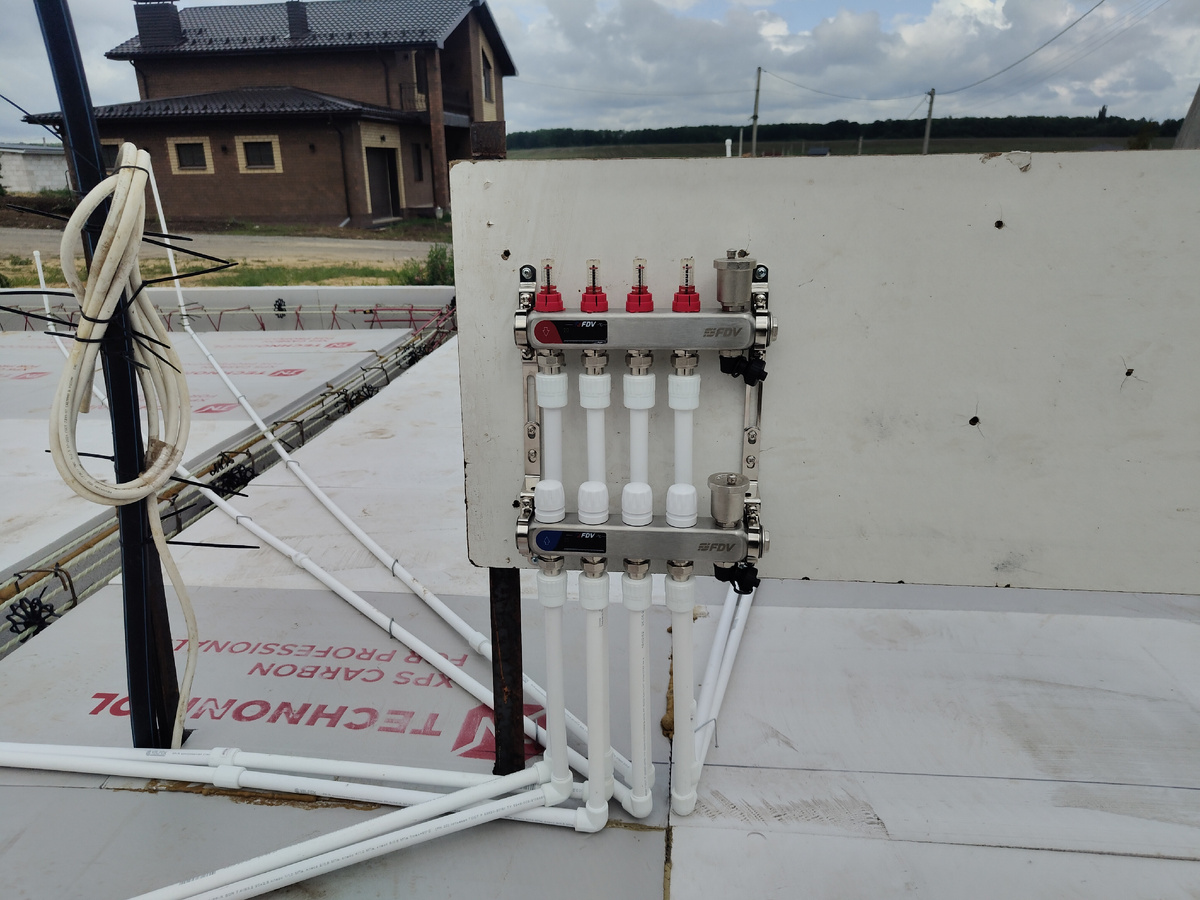 Далее из скважины закачали воду в трубы теплого пола, прокачивали пока весь воздух не вышел, потом перекрыли выход воды и нагнали давление в системе в 3 атмосферы и оставили в системе до следующего дня. На следующий день проверив манометр увидел, что давление немного упало, но это было из-за того, что трубы немного нагрелись на солнце и растянулись, нигде утечка жидкости не была найдена.