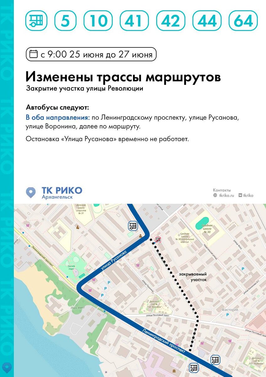 ❗️ Изменение движения для маршрутов 5, 10, 41, 42, 44, 64! ⠀ 🚌🚌 Перекрытие ул. Революции на участке дороги от просп. Ленинградского до ул. Почтовый тракт. ⠀ 🗺 Когда: с 9:00 25 июня 2025 года до 20:00 27 июня 2025 года. ⠀ ➡️ Автобусы будут следовать по: ул. Воронина В.И. - ул. Русанова - просп. Ленинградский при движении в обоих направлениях. ⠀ ❗️ На период перекрытия из маршрутов 41, 44, 64 ИСКЛЮЧАЮТСЯ остановочный пункты: Улица Русанова на ул. Воронина при движении в направлении ул. Никитова