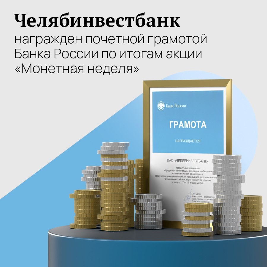 По итогам всероссийской акции «Монетная неделя», которая проходила с 7 по 19 апреля 2025 года, Банк России наградил Челябинвестбанк грамотой «Кредитная организация, принявшая наибольшее количество монеты от населения среди всех российских кредитных организаций, не являющихся системно значимыми». «Монетная неделя» проходит по инициативе Банка России при участии банков. В период действия акции каждый желающий может без комиссии обменять накопленную мелочь в отделениях Челябинвестбанка на банкноты или зачислить эти деньги на свой счет. Акция позволяет вернуть в оборот мелочь, которую хранят россияне дома.