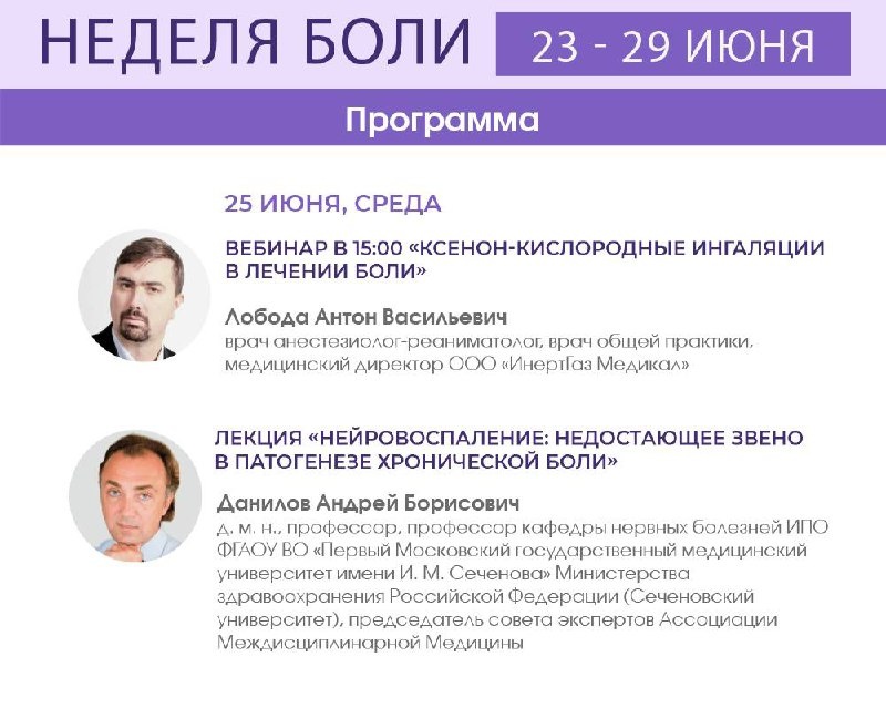 🩺Патогенез и новые подходы к лечению боли Сегодня в рамках Недели боли: 🔸Вебинар в 15:00 «Ксенон-кислородные ингаляции в лечении боли» О механизме действия ксенона, его эффективности и перспективах применения – расскажет врач анестезиолог и реаниматолог, врач общей практики Лобода Антон Васильевич 🔸Лекция «Нейровоспаление: недостающее звено в патогенезе хронической боли» Что запускает и поддерживает нейровоспаление? Какие перспективные препараты и стратегии направлены на подавление нейровоспаления? Разбирается Данилов Андрей Борисович, д.м.н., профессор, профессор кафедры нервных болезней ИПО Первого МГМУ им. И.М. Сеченова. Страница Недели боли: https://www.lvrach.ru/weeks/pain/25-06 #Неделя_боли