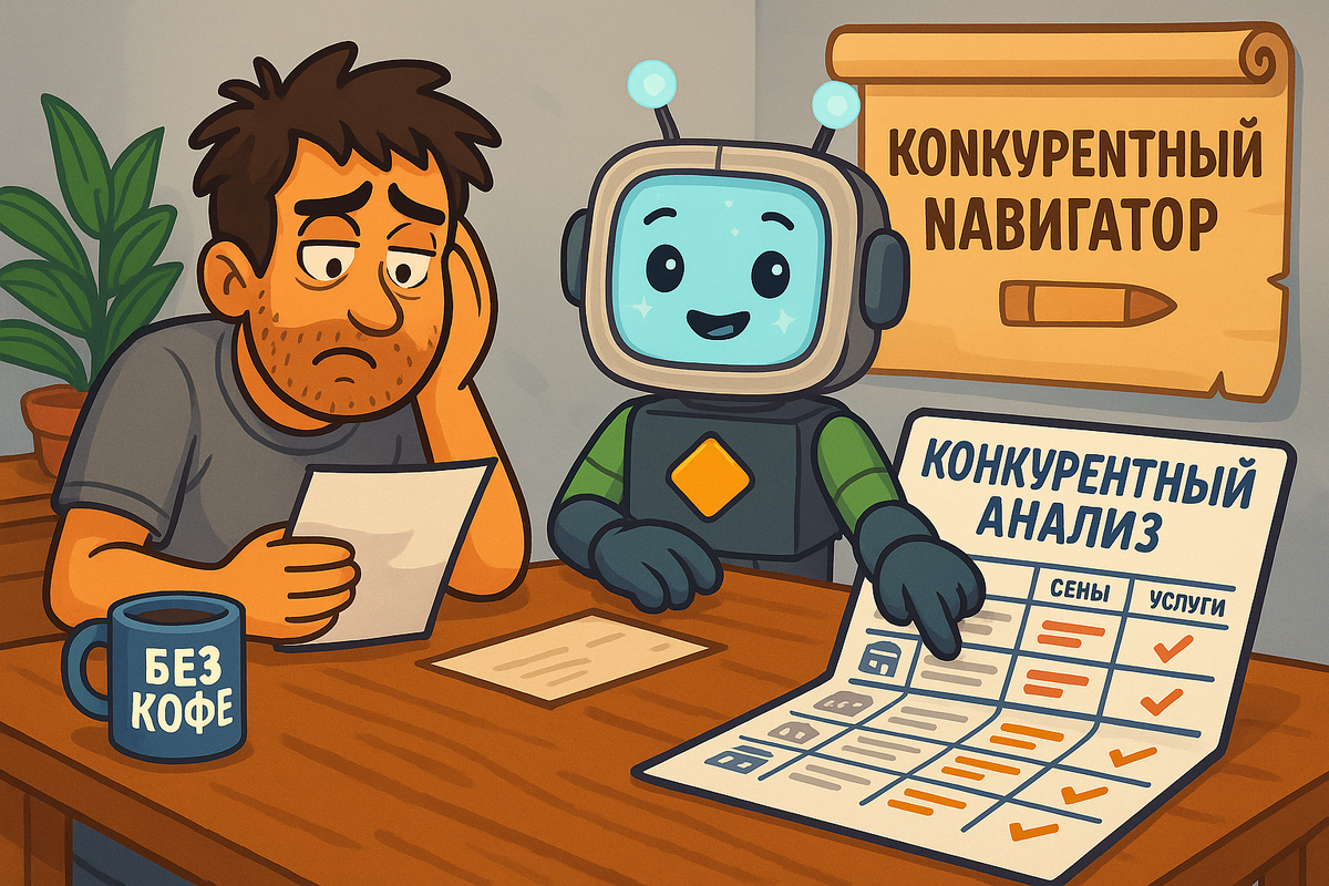 Это было утро пятницы, 07:46. Я сидел на кухне в старой серой футболке, в которой обычно мыл полы, и смотрел на пустой документ с заголовком: «Конкуренты в нише онлайн-школ». За окном моросил мелкий дождь, из чайника пахло липой, а в голове стучало только одно: "Ну где эти грёбаные конкуренты? Почему всё так разрозненно? Почему каждый раз — с нуля?" Я искал информацию вручную: сайты, каталоги, лендинги, обзоры. Собрал 5 компаний. Из них у троих не было нормального описания, а у одной — всё на английском. Я чувствовал, как спина ломит от стула, а в голове распухает раздражение. Я даже подумал: "А может, не делать этот анализ вообще? Просто запустить вслепую?" Но потом что-то щёлкнуло. Я открыл Telegram и надиктовал голосовуху: "Создать агента, который будет копать рынок. Глубоко. Без воды. По ключевым параметрам. Сравнение. Цены. Услуги. Тренды. Сделать это раз и навсегда". Так и родился Конкурентный навигатор Я начал с простого: сформулировал 4 обязательных параметра анализа. Потом обу