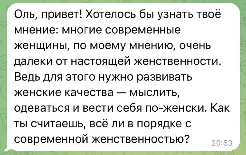 #вопрос_ответ Про женственность Хочу поделиться с вами своей историей о том, как я пришла к пониманию настоящей женственности — той самой, которая живёт внутри и не боится быть разной. Когда мне было 18, я впервые услышала от «добрых» советчиков фразу: «Будь женственнее — мягче, тише, молчи и не ругайся». В этот момент внутри что-то сжалось. Казалось, меня просят стереть с карты себя настоящую — заменить живой, горящий огонь на холодный, пустой пластик идеала. Меня словно хотели запихнуть в тесный коробок чужих ожиданий. Я много лет пыталась вписаться в этот образ, играть роль, которую от меня ждали. Но чем больше я старалась, тем труднее мне становилось дышать свободно. Внутри росла борьба — между тем, кем меня хотели видеть, и тем, кем я была на самом деле. Я терялась. Как оставаться собой, если старые модели общения ломаются, а новых ещё нет? В 29 лет я решилась на глубокое путешествие — внутрь себя через духовный поиск, честные вопросы и ответы, которые порой были страшными. И