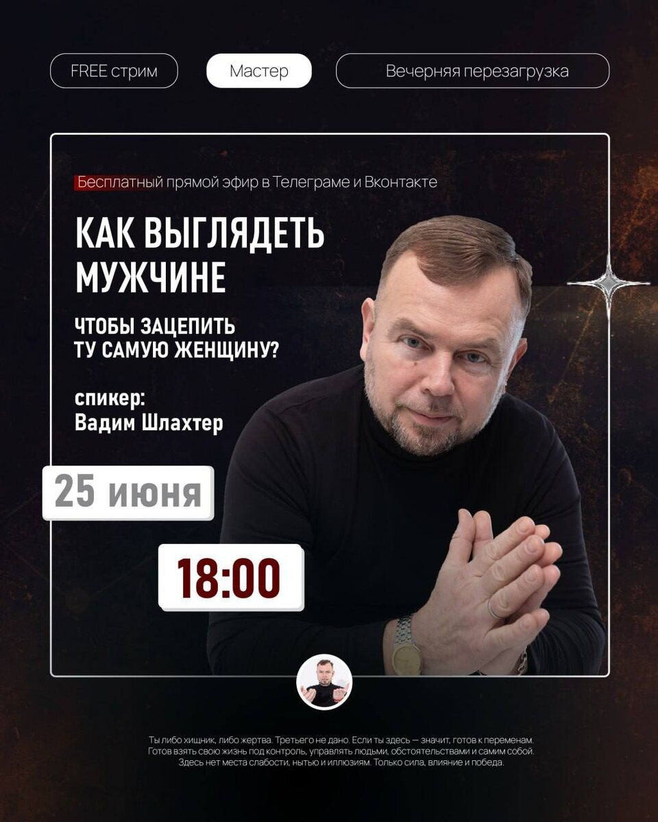 🔴🔴🔴🔴🔴 Бесплатный стрим «Как выглядеть мужчине, чтобы зацепить ту самую женщину». Задавайте свои вопросы по теме в комментариях к этому посту — на все отвечу в прямом эфире. ⏳ 25 июня в 18:00 (длительность до 30 минут) 🕙 Подключайся Вконтакте или Телеграме. Я провожу «Вечернюю перезагрузку» каждую среду. Запись эфира выложу в частном канале.