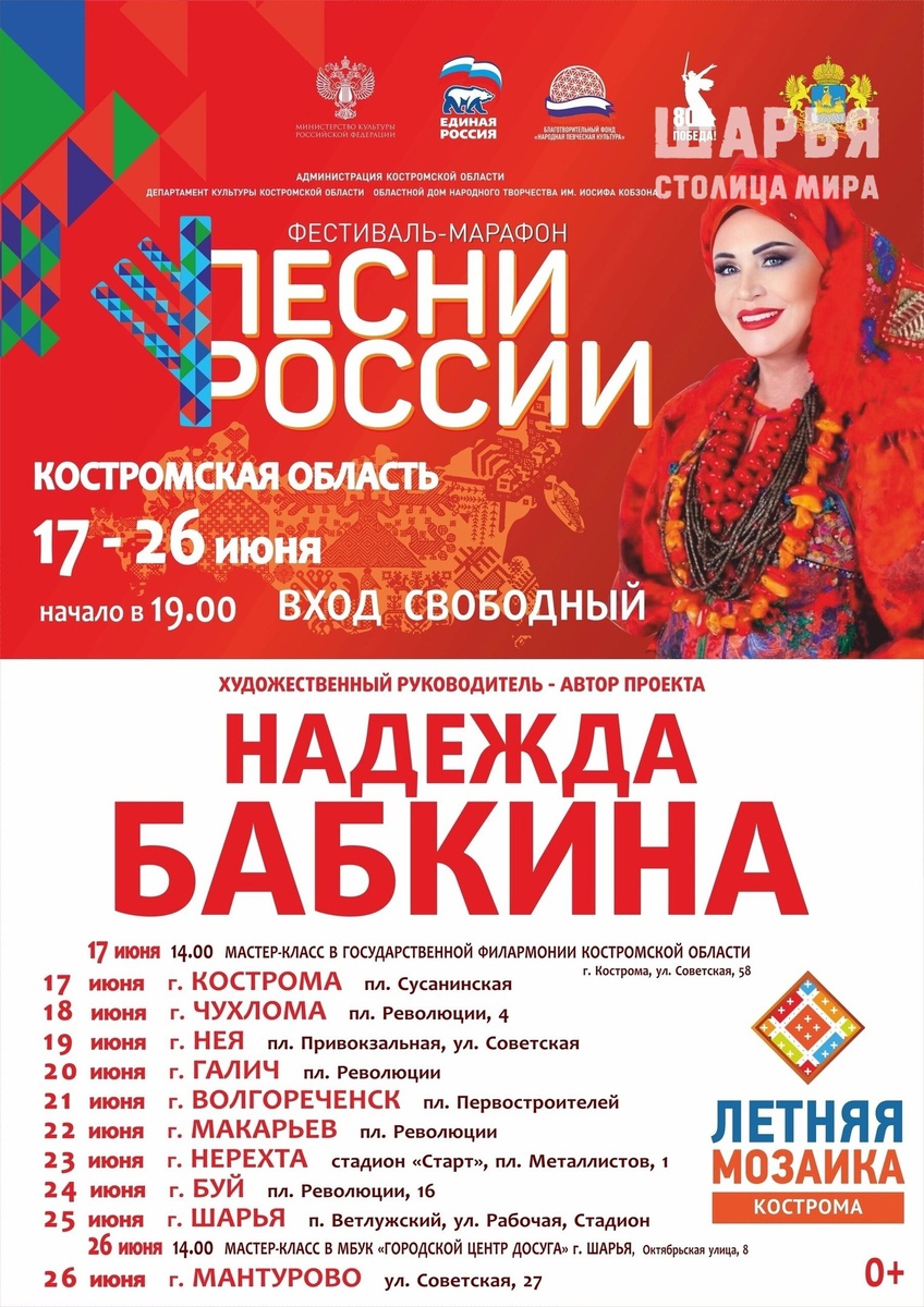#СейчасШарья Перед зрителями выступят народная артистка России Надежда Бабкина и Московский государственный ансамбль «Русская песня». Кроме того: Шоу-балет «Живая планета», Фолк-группа «После одиннадцати», Ансамбль «Россияне», Этнографическая фольклорная студия «Мерема», Губернаторский театра танца Государственной филармонии Кузбасса «Сибирский калейдоскоп» , ансамбль казачьей песни "Криница", Солистка Анна Кузьмищева, исполнительница национальных танцев народов Севера и Дальнего Востока Олит Тевлянаут, актер, певец, композитор Иван Замотаев. Ждем вас 25 июня в 19.00 на стадионе в Ветлужском (ул. Рабочая) Шарья – столица мира Крупнейшее городское СМИ Источник