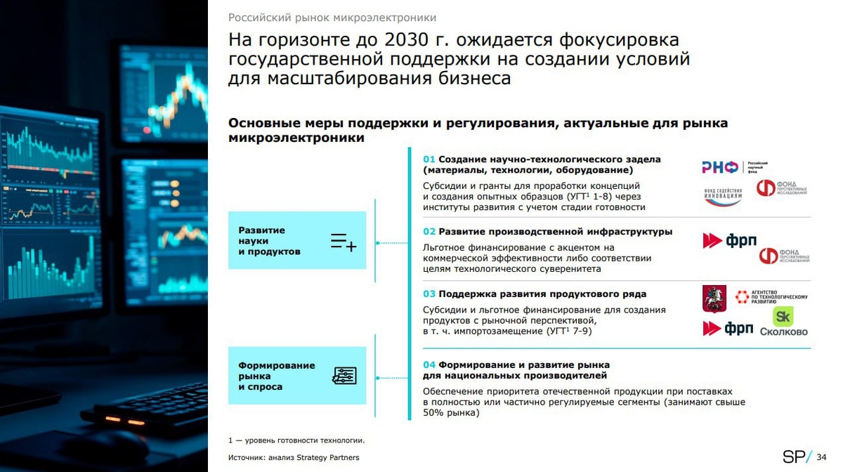 К 2030 году объем российского рынка микроэлектроники вымахает до 1 трлн рублей, следует из оптимистичного сценария развития индустрии. По оценке Strategy Partners, доля отечественных компаний на российском рынке будет расти со среднегодовым темпом развития в 25% вплоть до 2030 года. Импорт тоже будет на подъеме, но куда более скромном — всего 8%. Аналитики отмечают, что суверенитизация железа стала всемирным трендом. Не один только Трамп беспокоится о том, чтобы «приземлить» производство чипов на родную почву, аналогичные проекты реализуются уже и в ЕС — на гранты производителям уйдет 47 млрд $. В США, для сравнения, на это потратят 52,2 $ млрд. Все это меркнет, впрочем, на фоне Китая — там обещают поддержку в размере 142 млрд $ в фонды. В SP считают, что устойчивый рост спроса со стороны основных отраслей будет подталкивать развитие отечественного производства железа. Примечательно, но аналитики считают, что даже изменение санкционной политики не повлияет на прогнозы развития рын