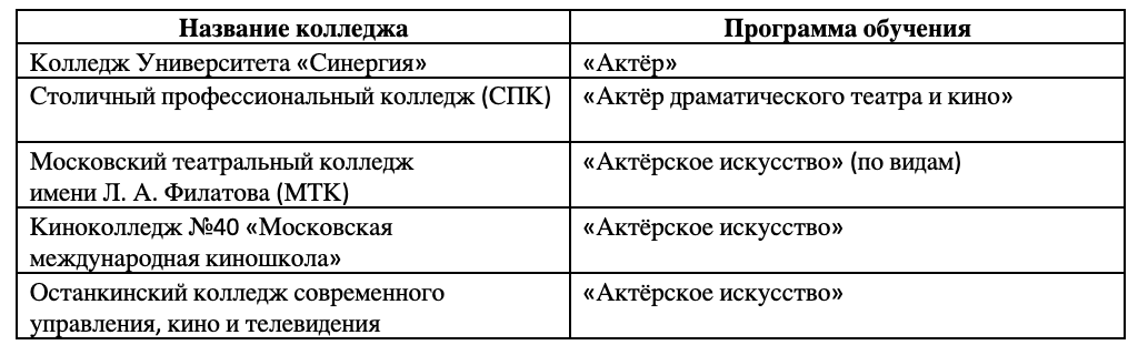 Поступление в театральный колледж — первый шаг на пути к карьере актёра или актрисы. Актёрское мастерство осваивают в театральном училище, школе или многопрофильном ссузе, где есть актёрский факультет. Поступить можно после 9 или 11 класса без ЕГЭ. Зачисление проходит по конкурсу аттестатов, дополнительно нужно сдать творческое испытание выбранного учебного заведения. Мы изучили рейтинги театральных ссузов на образовательных порталах и выделили пять самых популярных колледжей с театральным профилем и наличием театральных специальностей👇 На театральном факультете в Колледже «Синергия» доступна очная форма обучения. Студенты участвуют в театральных проектах и международных программах, организуют спектакли, проходят практику в кино и на телевидении — например, играют эпизодические роли в сериалах. Они стажируются в Московском музыкальном театре для детей и юношества «На Басманной», участвуют во Всероссийском фестивале-школе любительских театров «В главной роли» и других конкурсах. Обучен