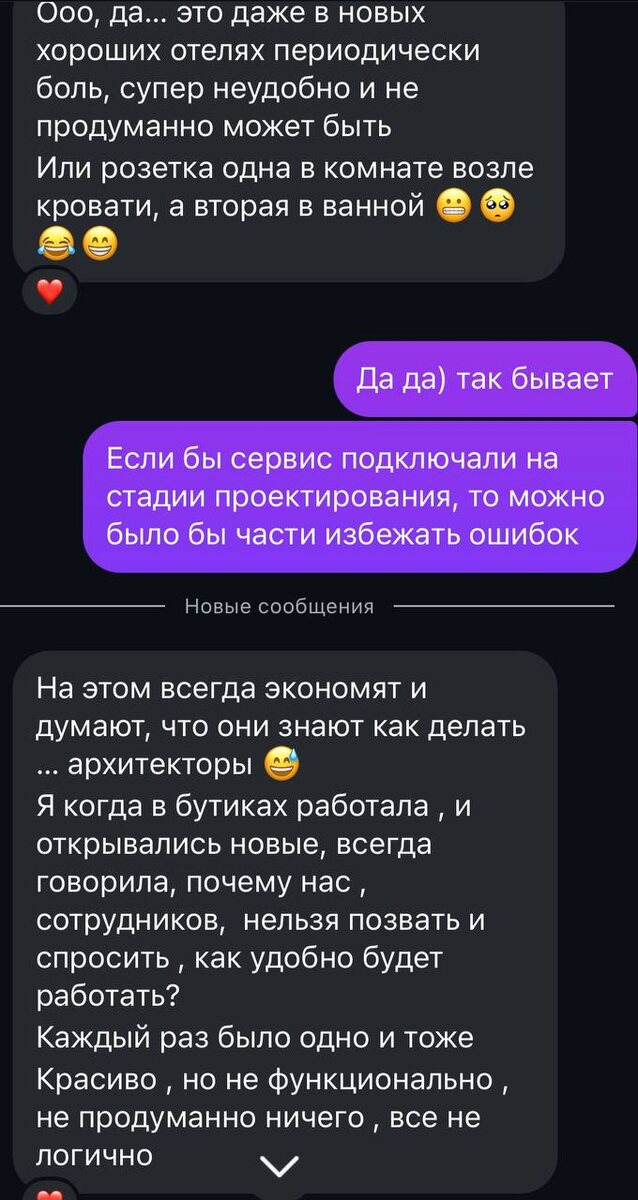 Человек в центре интерьера. Интерьер создается под привычки людей. Мы пишем историю жизни семьи через интерьер. Спросить тех, кто будет пользоваться - вот главная задача дизайнера. И только потом придумывать идею. Сначала функционал, потом красота.