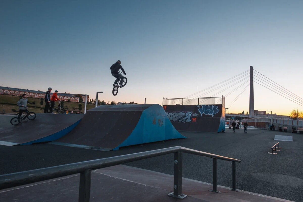 Мастера трюков на велосипедах оценят памп-трек. На территории работает прокат велосипедов, самокатов, роликовых коньков.