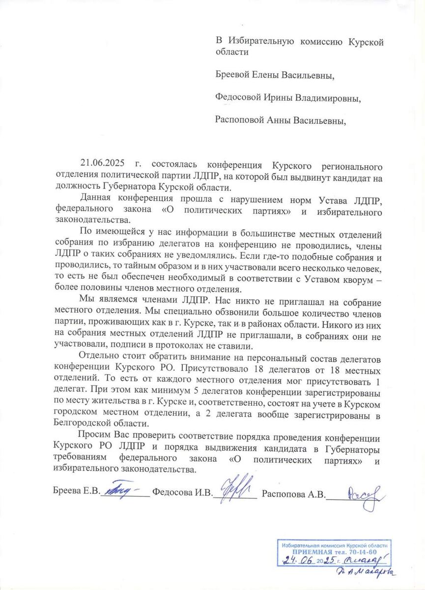 21 июня Курское региональное отделение ЛДПР провело конференцию, на которой был выдвинут кандидат на должность губернатора Курской области. Однако в Избирательную комиссию и в Управление Минюста по Курской области поступили жалобы от членов партии, утверждающих, что мероприятие прошло с нарушением законодательства. По их словам, конференция была организована без соблюдения норм Устава ЛДПР, федерального закона «О политических партиях» и избирательного законодательства. В большинстве местных отделений, как утверждают заявители, не проводились собрания по избранию делегатов, а рядовых членов партии не уведомляли о проведении подобных мероприятий. — Мы — действующие члены ЛДПР. Никто из нас не получал приглашений на собрания местных отделений. Мы обзвонили большое количество однопартийцев, проживающих в Курске и районах области. Никого из них не приглашали, и никто не ставил подписи в протоколах, — говорится в обращении. Особое внимание заявители просят обратить на состав делегатов конфер