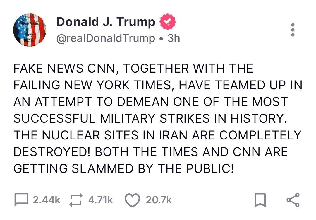Были ли уничтожены ядерные объекты Ирана или нет? Вчера New York Times и CNN опубликовали статьи, «основанные на отчетах американской разведки», в которых утверждается, что иранские ядерные объекты не были уничтожены или были лишь частично повреждены в ходе атак на Иран (с акцентом на американские атаки). Президент Трамп открыто выступает против них и называет их сообщения фейковыми новостями. Президент Трамп повторяет (в прикрепленном твите, опубликованном несколько часов назад) свое четкое заявление: Ядерные объекты Ирана были полностью уничтожены. Министр обороны США также выступил с заявлениями в аналогичном ключе.