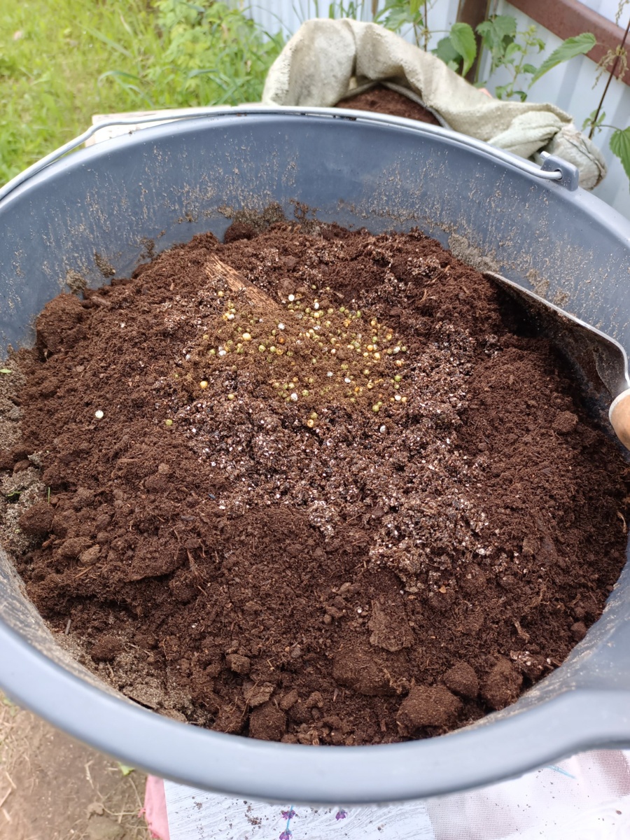 Землю прошлого сезона убираю. Лишь поверху. Там сорняки полезли, ох да мелкий мусор. Добавляю суздальского чернозёма, вермикулита, и заправку из бокаши + микоризы + осмокот.