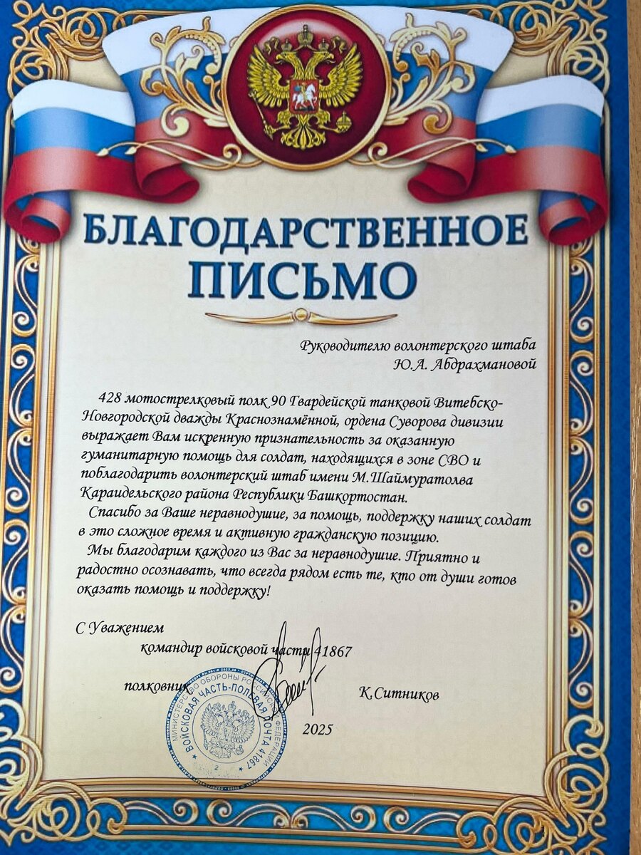 Приятной новостью с нами поделилась руководитель штаба Юлия Абдрахманова. Волонтерские штабы имени Шаймуратова в Башкортостане включились в поддержку участников СВО практически с самого начала специальной военной операции. В их числе действует и подразделение штаба в села Караидель, руководит которым Юлия Абдрахманова. Сотрудники и волонтеры нашего штаба регулярно и активно занимаются сбором, комплектованием и даже изготовлением гуманитарной помощи, например, окопных свечей и маскировочных сетей. Все то, что жители района отправляют для передачи солдатам, в штабе тщательно сортируют, упаковывают и передают для дальнейшей отправки. Добросердечная работа сотрудников и волонтеров штаба не остается незамеченной. Недавно они получили официальную благодарность от командования одной из воинских частей за важный вклад в поддержку военнослужащих. Эта отметка признает усилия волонтеров, которые каждый день работают на благо защитников Родины, демонстрируя истинный дух единства и патриотизма. Так