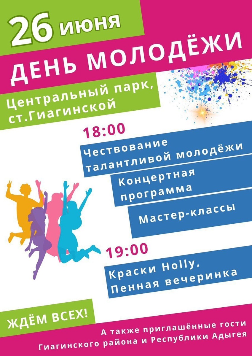 26 июня в Центральном парке ст. Гиагинской в 18:00, состоится праздник для самых ярких, активных, энергичных и креативных представителей нашего района — День молодёжи!