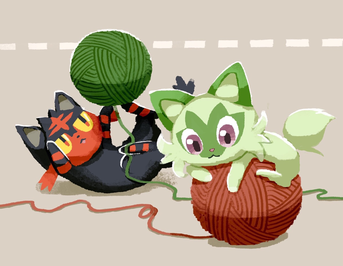 ✏️ Теги: #aruco_co #brown_background #closed_mouth #colored_sclera #commentary #highres #litten #no_humans #pokemon #pokemon_(creature) #purple_eyes #red_eyes #sprigatito #yarn #yarn_ball #yellow_sclera