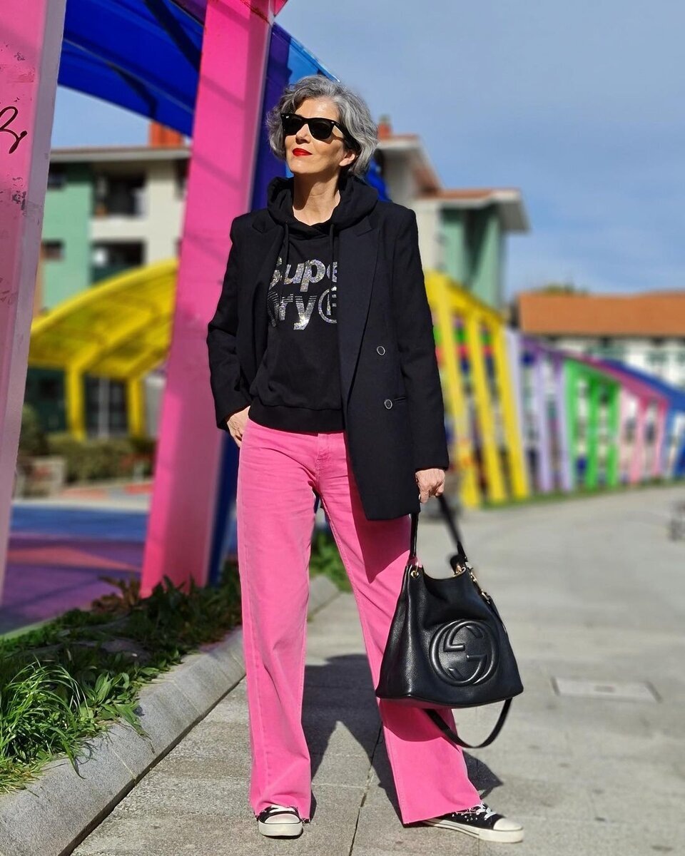 7. Смягчить яркость розового цвета, даже расположенного у лица, поможет совмещение его в едином ансамбле с кофейно-коричневыми джинсами прямого кроя. Спокойный и мягкий цвет низа уравновешивает яркость верха, а оригинальные насыщенно-розовые мюли свяжут верх и низ в гармоничный ансамбль, освежающий внешний вид и добавляющий женщине за 50 молодости.