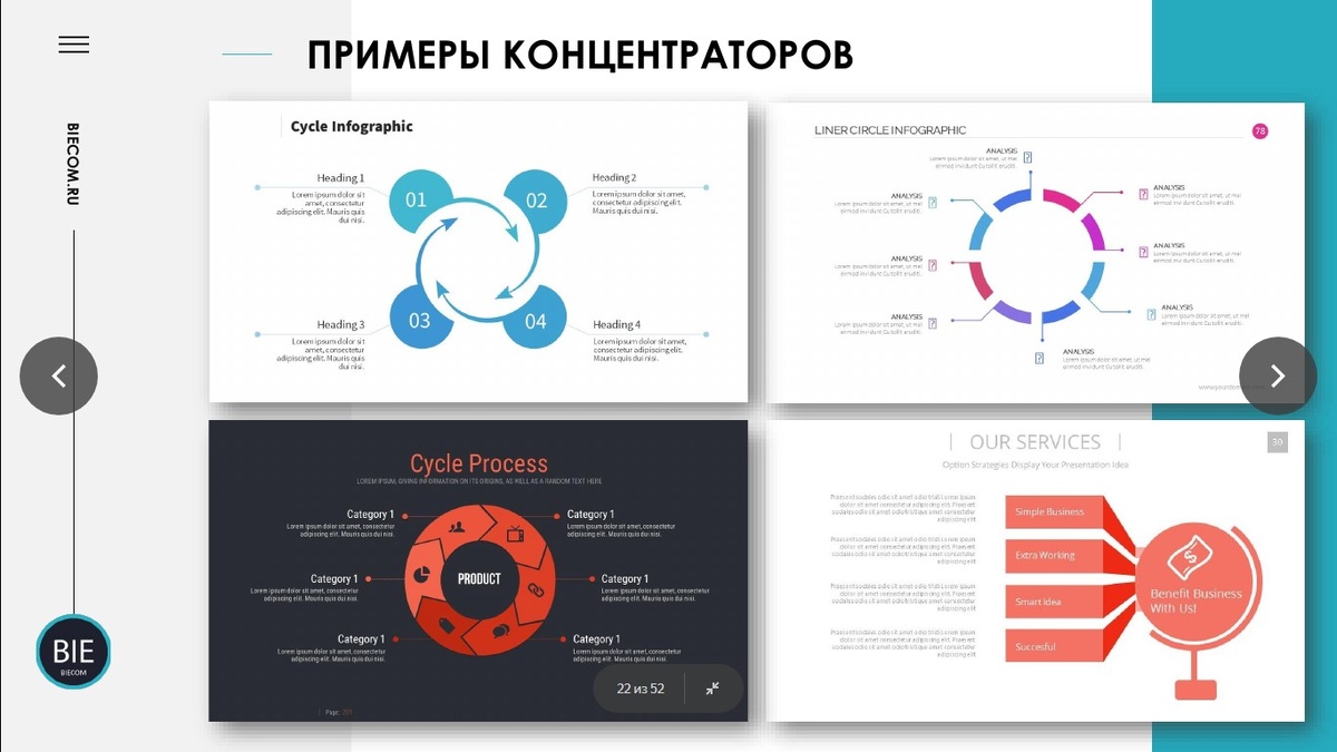Инфографика в PowerPoint: 5 примеров на случай, если фантазия иссякла Вечер перед выступлением, вы усердно трудитесь над презентацией. Все бы ничего, но фантазия уже на исходе, а впереди верстка еще 20 слайдов. Знакомая ситуация? Уверены, что почти каждый, кто готовит презентации, хоть раз сталкивался с подобной проблемой. Если идеи, как «задизайнить» слайды, закончились, не спешите паниковать. Возможно, наши примеры будут вам полезны. Мы — маркетинговое агентство Biecom. Более 10 лет наша команда создает презентации для бизнеса, для внутренних и внешних коммуникаций. Сегодня расскажем о 5 идеях применения инфографики, которые вы без труда сможете адаптировать под своей проект. Инфографика — это набор графических элементов (таких как изображения, схемы, геометрические фигуры, иконки), с помощью которых в презентации можно передать сложную для восприятия информацию. Главные преимущества инфографики: ● Позволяет наглядно и просто показать сложные данные. Приходится признать, что никто не