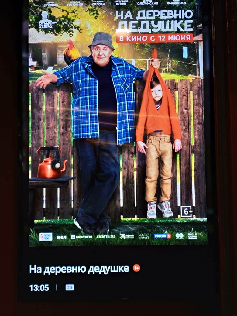 Всем привет. С утра опять было хмуро, и все же я решила сходить в кино, как собиралась накануне. Пошла смотреть фильм "На деревню дедушке" с Юрием Стояновым в главной роли. Мне почему-то казалось, что фильм будет добрым и смешным, но я ошиблась. Начну рассказывать по порядку. Пошла в "Каро 5" на Дыбенко. От меня этот кинотеатр в шаговой доступности, но это я так считаю 😅. А вообще до него ехать на транспорте шесть остановок, но я хожу пешком. Иду через парк и тем самым сокращаю путь. Отзывы об этом фильме не читала, видела только рекламку с Юрием Стояновым и мальчиком. Людей, на удивление, было много, я ходила на 13:05, человек 10 было. Были бабушки с внуками и без внуков, и были подростки, что меня удивило. Сюжет фильма достаточно прост: молодой женщине, строящей карьеру, нужно было на три дня куда-то пристроить своего десятилетнего сына. Мальчик был в меру избалован, особого уважения к взрослым не испытывал. Он был увлечён нейросетями, у него даже был проект, который буквально ч