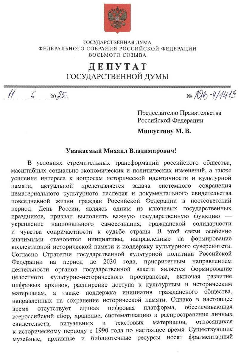 🖥Предложила создать цифровую платформу-архив истории России в период с 1990 года