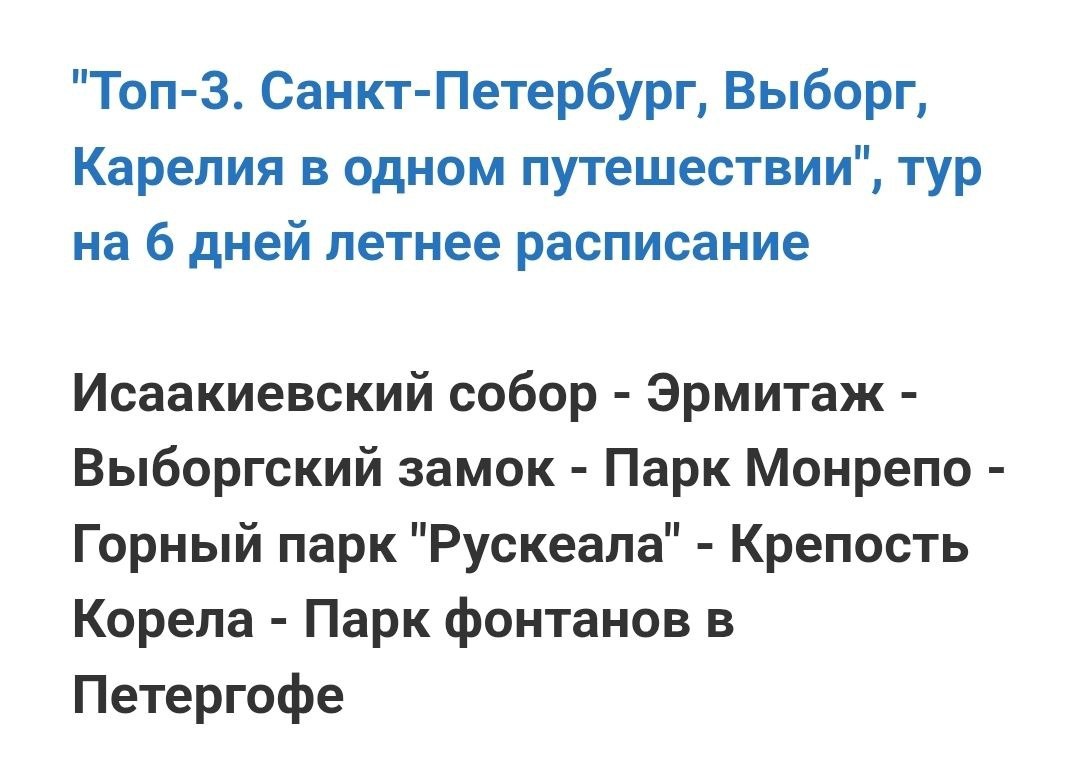 Санкт-Петербург, Выборг, Карелия в одном путешествии - 2 Вы полюбуетесь панорамой красавицы Невы, увидите великолепные ансамбли центральных городских площадей и знаменитые петербургские памятники. Горный парк «Рускеала» - жемчужина карельской природы. Основная достопримечательность - знаменитый своей красотой Мраморный каньон. Огромная чаша из белого камня, вырубленная рукой человека в скальной породе, наполовину наполнена водой изумрудного оттенка. Именно отсюда доставляли мрамор для Мраморного и Мариинского дворцов, Исаакиевского собора. Даты начала туров в 2025 г.: Июль: 07 и 21 Август: 11 и 25 Стоимость тура от 44000 руб за человека при 2-х мест размещении