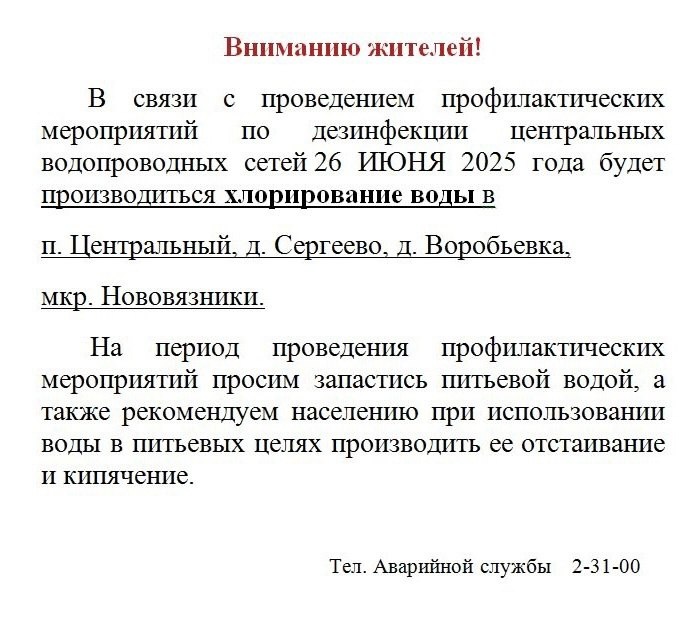 Вниманию жителей! В связи с проведением профилактических мероприятий по дезинфекции центральных водопроводных сетей 26 ИЮНЯ 2025 года будет производиться хлорирование воды в •. Центральный, д. Сергеево, д. Воробьевка, мкр. Нововязники. На период проведения профилактических мероприятий просим запастись питьевой водой, а также рекомендуем населению при использовании воды в питьевых целях производить ее отстаивание и кипячение. Подари звезду на пост - это часть нашей монетизации