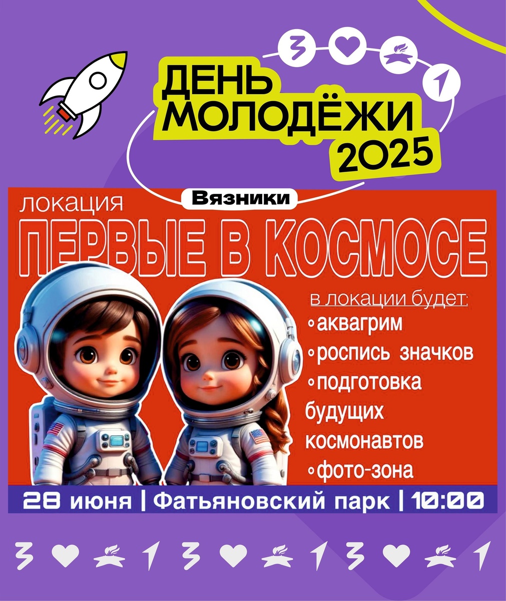 Друзья спешим вам рассказать, что в рамках Дня молодёжи активисты Движения Первых решили порадовать вас интересными локациями. Одна из них будет называться «Первые в космосе», здесь вам предстоит выполнить не сложные задания и получить удостоверение будущего космонавта.