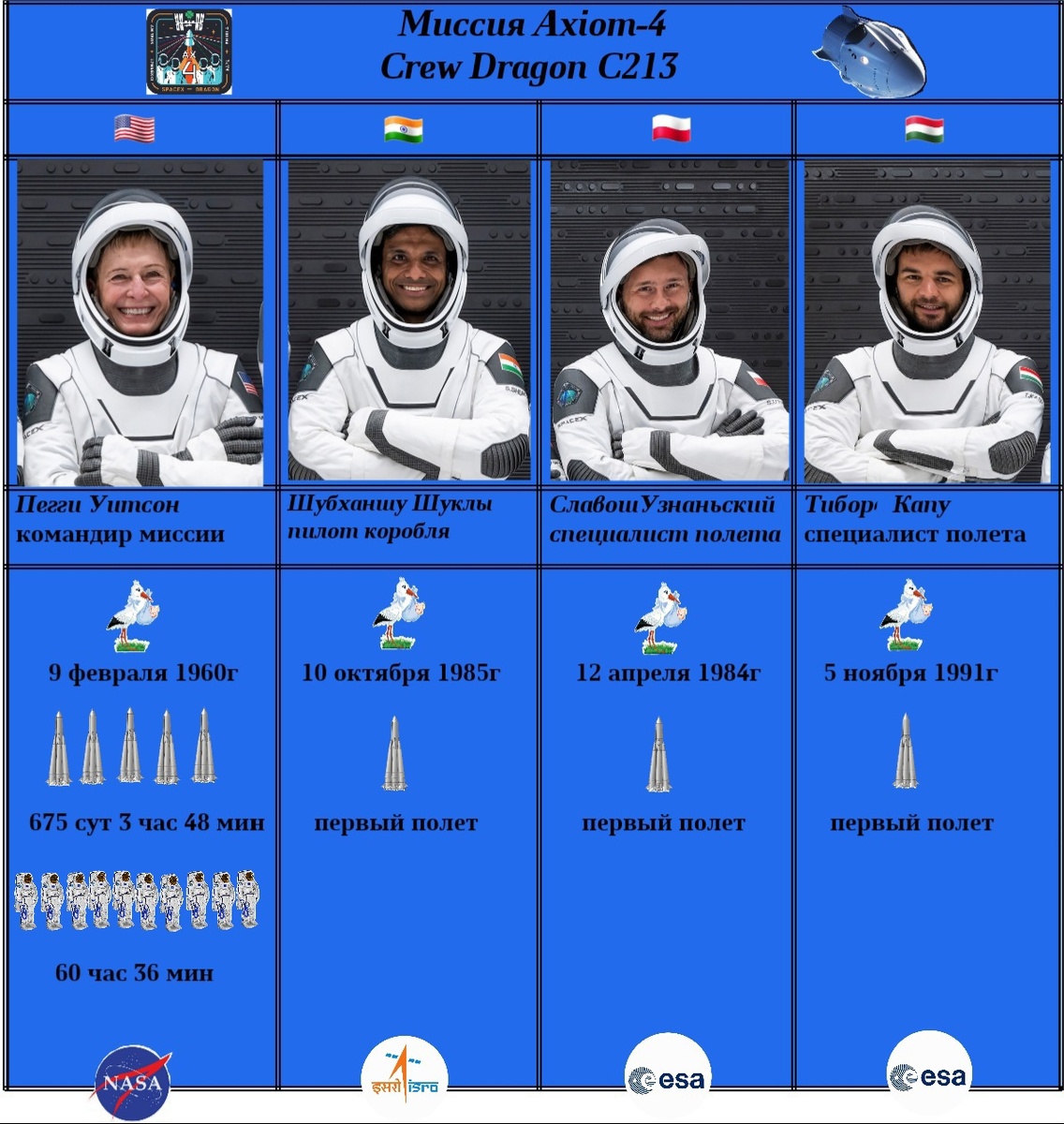 — Впервые в качестве астронавтов на орбиту полетят представители Индии, Польши и Венгрии, при этом Шукла станет вторым индийцем, отправившимся в космос, Узнаньский - вторым поляком, а Капу - вторым профессиональным участником космического полёта из Венгрии и третьим венгром, полетевшим в космос