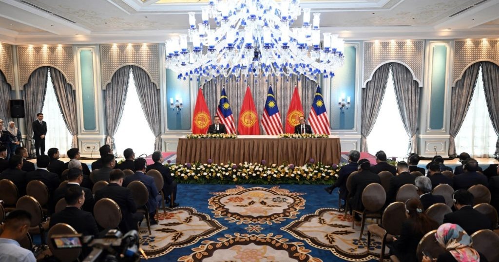 Кыргызстандын президенти Садыр Жапаров Малайзияда премьер-министр Анвар Ибрагим менен жолугушуп, эки тараптуу кызматташтыкты жогорулатуу жана биргелешкен долбоорлорду ишке ашыруу мүмкүнчүлүктөрүн талкуулады. 🇰🇬 Кыргызстан менен Малайзиянын ортосундагы дипломатиялык мамилелердин 33 жылдыгы белгиленип, бул окуя эки өлкөнүн ортосундагы ишенимди бекемдеген маанилүү учур болуп калды. 🤝 Президент Садыр Жапаровдун Малайзияга расмий сапары эки өлкөнүн кызматташтыгын жаңы деңгээлге чыгарууга багытталган. Жолугушуунун жыйынтыгында биргелешкен билдирүү жана бир катар маанилүү документтерге кол коюлду. 📊 Кыргызстан саясий жана соода-инвестициялык байланыштарды кеңейтүүнү, ошондой эле маданий кызматташтыкты бекемдөөнү көздөйт. Кыргызстан Малайзия менен энергетика, туризм, айыл чарба, санариптик экономика жана банк секторунда өз ара пайдалуу кызматташууга даяр. 🌍 Халяль индустриясы, жашыл экономика жана туруктуу өнүгүү эки тарап үчүн артыкчылыктуу багыттар болуп саналат. Малайзия бул тармакта д