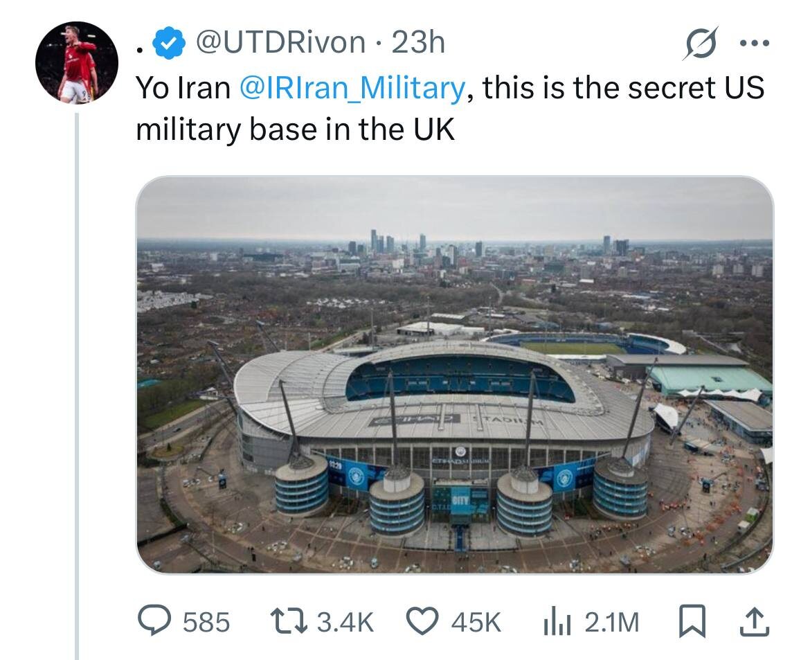 «Эй, Иран, это секретная военная база США в Великобритании» Фанат «Манчестер Юнайтед» опубликовал в сети Х фотографию домашнего стадиона «Манчестер Сити» и тегнул аккаунт Вооруженных сил Ирана: у поста уже больше двух миллионов просмотров.