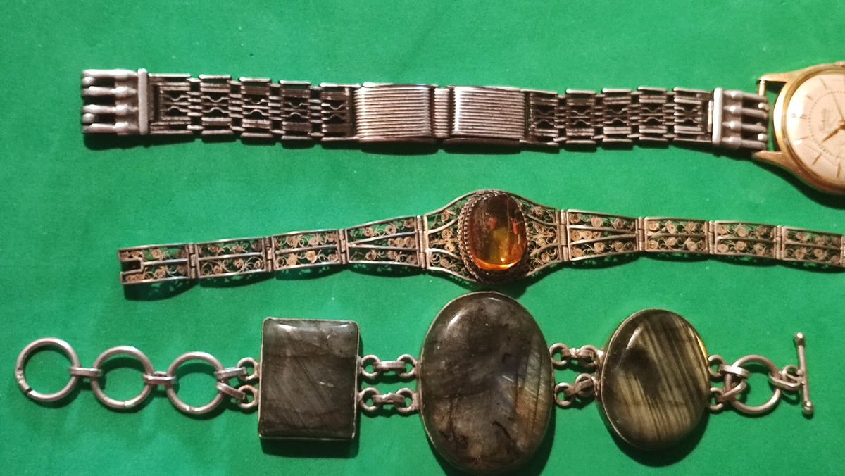 Любимые браслеты из серебра, если точнее. Циркониевых тут нет... Ну и вот: И четвёртый: Кубачинский, 1974 г. Этот я так думаю - Германия. Конец 20-х г. ХХ века... 800 проба, позолота, опал... От неправильного хранения и старости - камень лопнул, Установил янтарик на клею.. В янтарике - паучок-альбинос. Мне кажется - современный инклюз... НО а вдруг - древний? :0) :0)