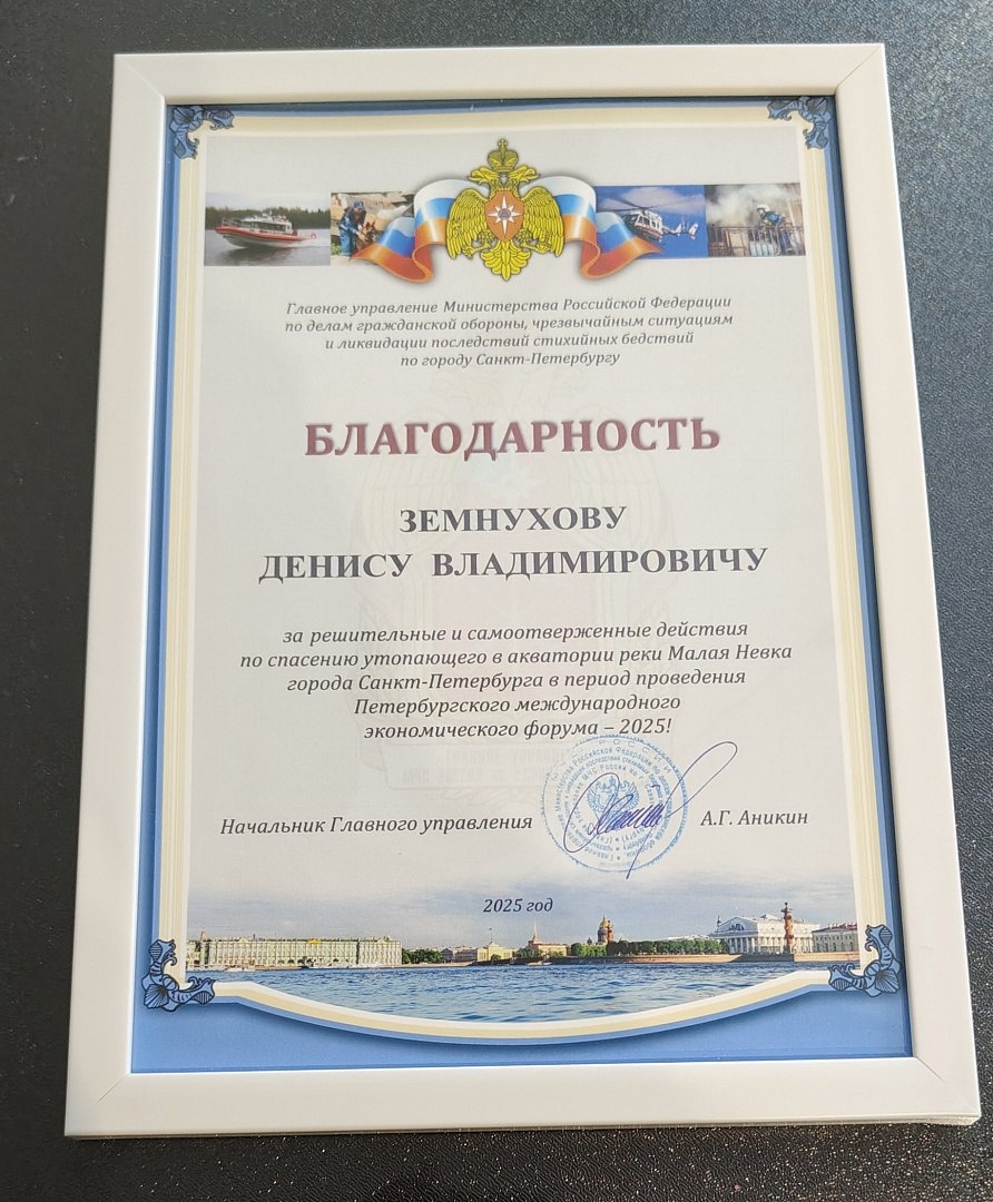 За решительные и самоотверженные действия по спасению утопающего Денис Земнухов был награждён грамотой от ГУ МЧС России по Санкт-Петербургу.