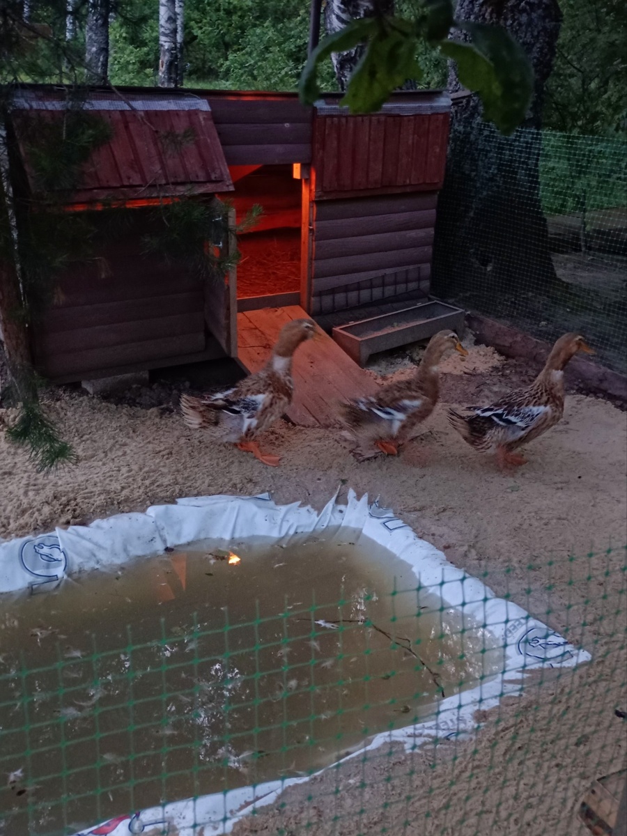 У взрослый уток тоже теперь всё по-человечески. На даче. И свой бассейн. И песчаный пляж. И тень сосен. И вкусная еда и чистая вода (не в бассейне же пить). И даже свет в домике.