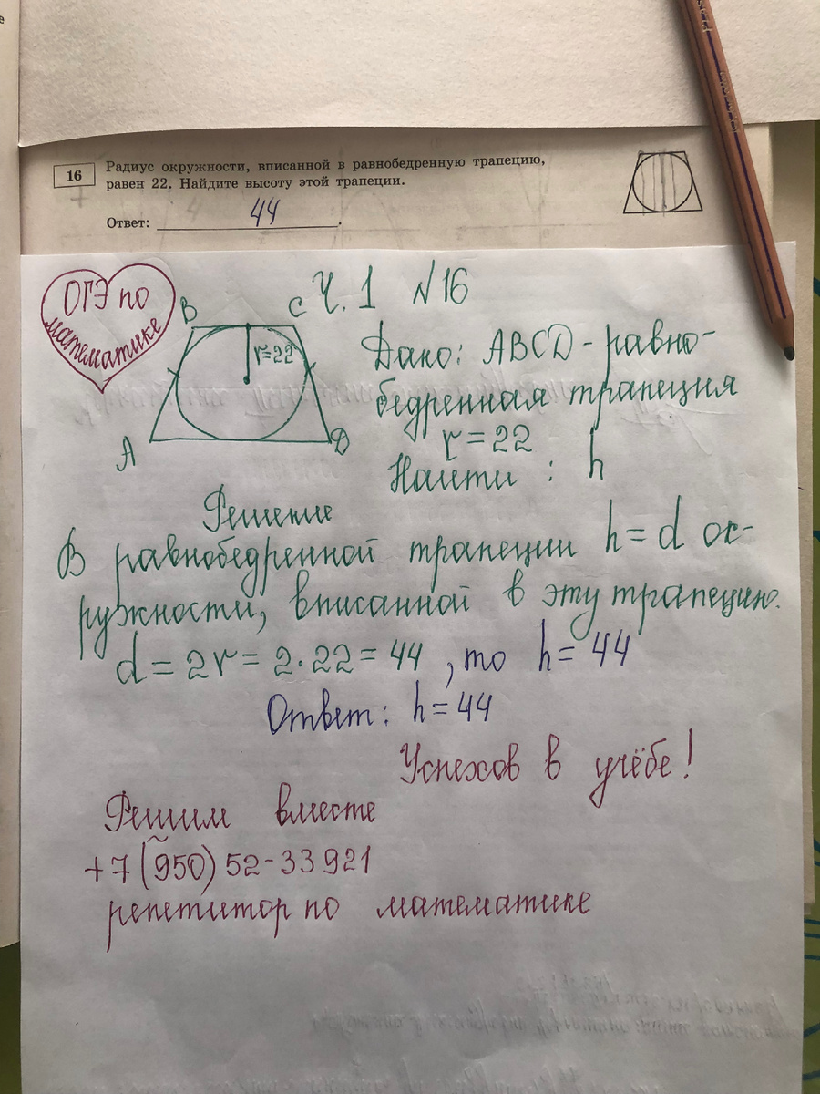 ОГЭ по математике: найти высоту равнобедренной трапеции, если дан радиус вписанной в нее окружности (ч. 1 номер 16)