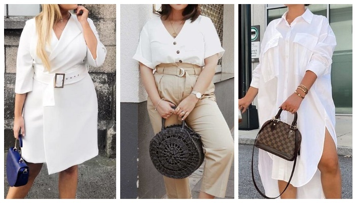 Например, обратите внимание на ансамбль, состоящий из оверсайз платья-рубашки белого цвета с асимметричным подолом, небольшой сумки, сандалий на плоской подошве с тонкими перемычками, акцентных солнцезащитных очков и крупных браслетов. Этот образ не только скроет недостатки фигуры, но и выгодно подчеркнёт её достоинства.