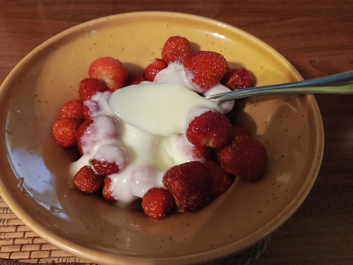 Последнее время я люблю есть такое: В прошлом году клубники было не так много, да ещё половина пропадала под дождями. А оставшаяся слегка кислила. В этом ягоды сладкие - и мелкие и крупные. Но я их всё равно ещё сгущенкой поливаю) Так-то я сладкое не очень люблю. Сахар вот в чай никогда не положу, например. Варенье не ем. Ну и много какие сладости не ем - мне кажутся слишком приторными. А вот сгущёнку могу. В двух видах - на блинах и поверх клубники) Но если я буду есть блины со сгущёнкой регулярно, то повторю фейл Винни Пуха и застряну где-нибудь в дверях. Ну а клубника вроде в этом смысле менее опасна) Опять же клубника - единственная ягода, которую я всерьёз уважаю) Ещё я люблю шелковицу и черешню, но шелковицу у нас не продают, а черешню я люблю ту, которая на Кубани росла у бабушки и у дяди. Та, что у нас продаётся, её только смутно напоминает. Вот и остаётся мне для любви и уважухи только клубника) Но сегодня аграрий привёз мне с дачи вот это: Очень вкусная ягодка. Но... это всё,