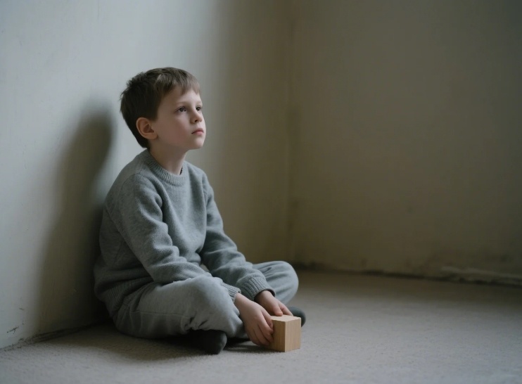 Мальчик взял кубик. Сел ровно. И уставился в стену.