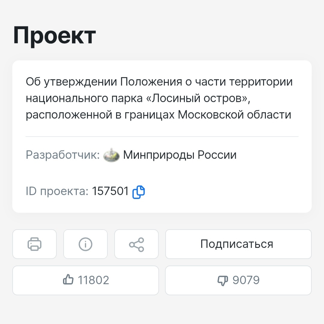 ❗️ До окончания голосования в рамках общественного обсуждения по поводу нового проекта положения об областной части «Лосиного острова» остались считанные часы. 🔴 Принятие этого документа означает, что строительство в национальном парке скандальной и пока наполовину не существующей дороги для въезда в Королёв будет предусмотрено положением о национальном парке. ❗️ С пятницы мы наблюдаем странный рост количества голосов в поддержку документа, который позволит разрушить один из самых старых нацпарков в стране. На эту минуту 11 802 голоса «за» (за 1,5 часа прибавилось почти 2 тысячи голосов) и 9 079 — «против». 🔴 Сама страница, на которой можно проголосовать, загружается не с первого раза. И на то, чтобы оставить свой голос, уходит много времени, но именно сейчас очень важно не опускать руки и сделать всё возможное, чтобы ваш голос был услышан. ❗️ Сегодня, 25 июня, до 23.59 проголосуйте против автомобильной дороги, которая может уничтожить «Лосиный остров». Распространите информацию. И,